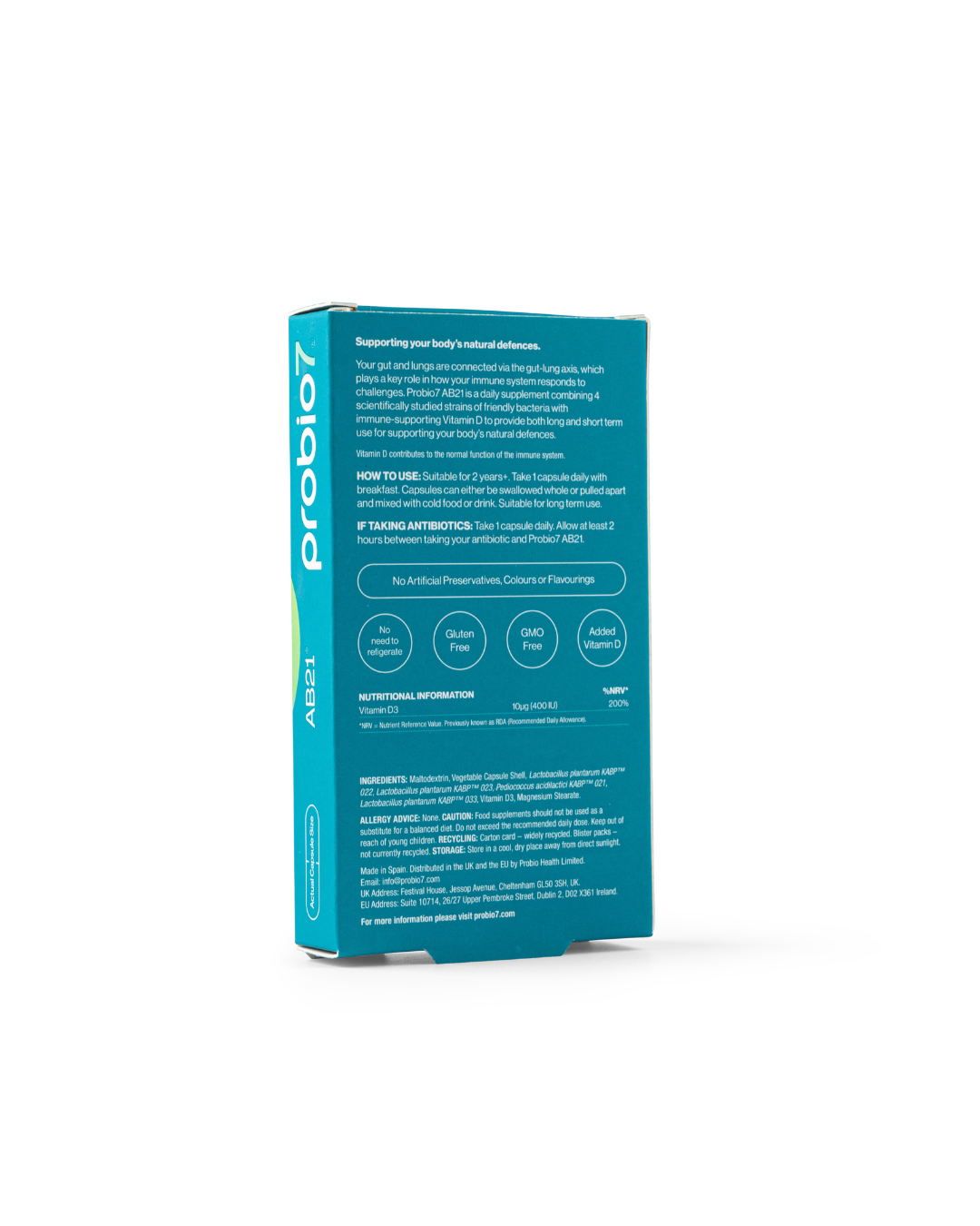 Probio7 Professionals AB21 – A clinically validated supplement for respiratory and immune health. Includes added vitamin D, shown to help maintain immune defence.